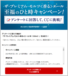 メーカーとタイアップ施策となっており、応募者の属性などアンケート回答後にインスタントウィンが行われるキャンペーンです。